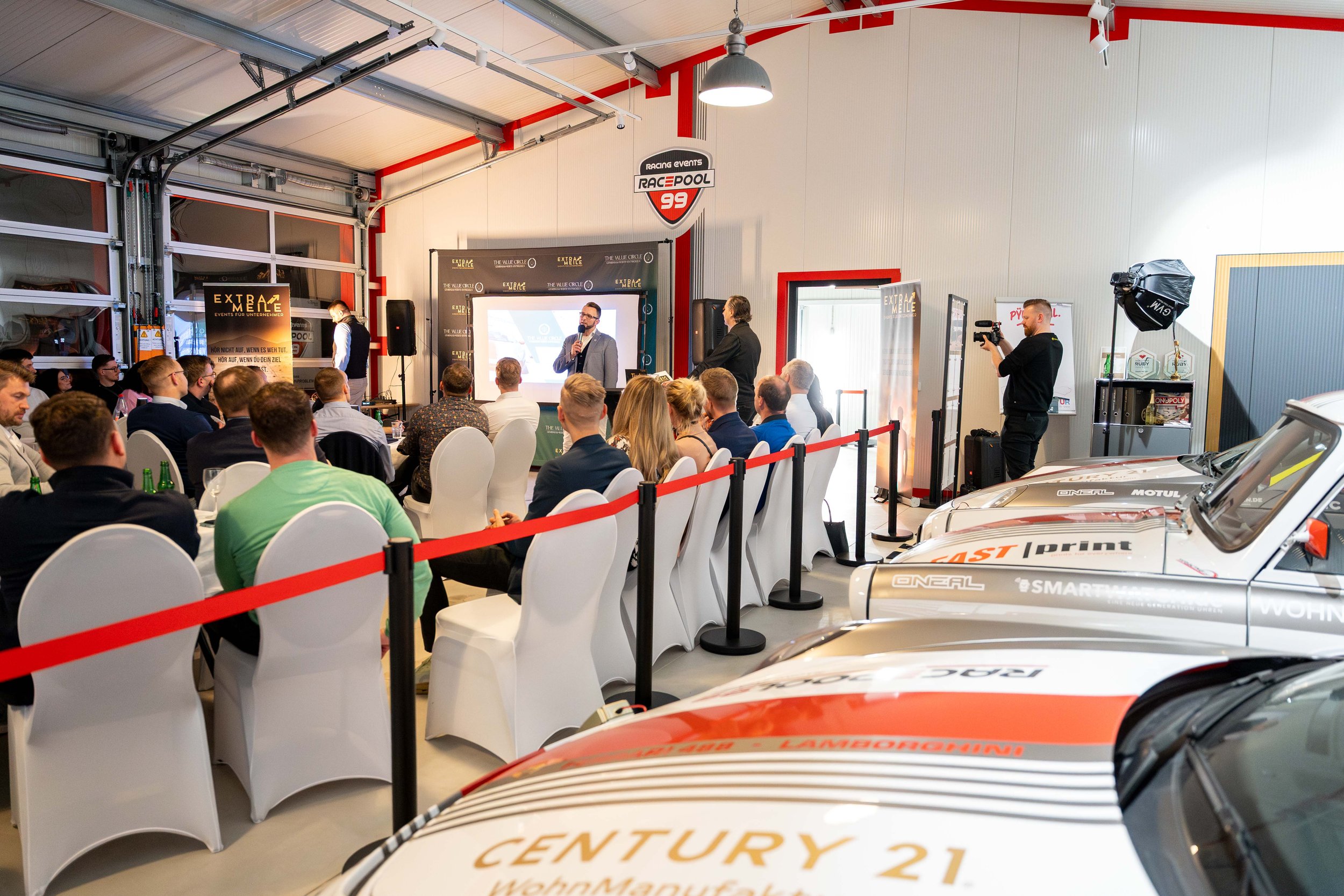 Ein besonderer Dank gilt dem Team von Racepool99! Eure außergewöhnliche Location zwischen beeindruckenden Sportwagen hat der ExtraMeile genau den Rahmen gegeben, den wir uns gewünscht haben: dynamisch, inspirierend und alles andere als ein gewöhnlicher Konferenzraum. Danke für die fantastische Gastfreundschaft und die reibungslose Zusammenarbeit – diese einmalige Kulisse hat den Abend für alle Teilnehmer absolut unvergesslich gemacht!