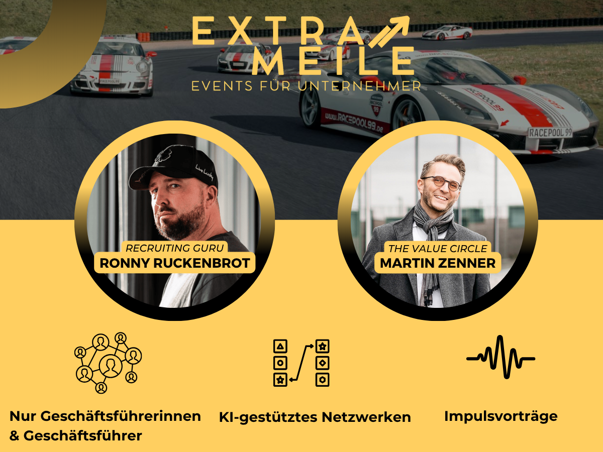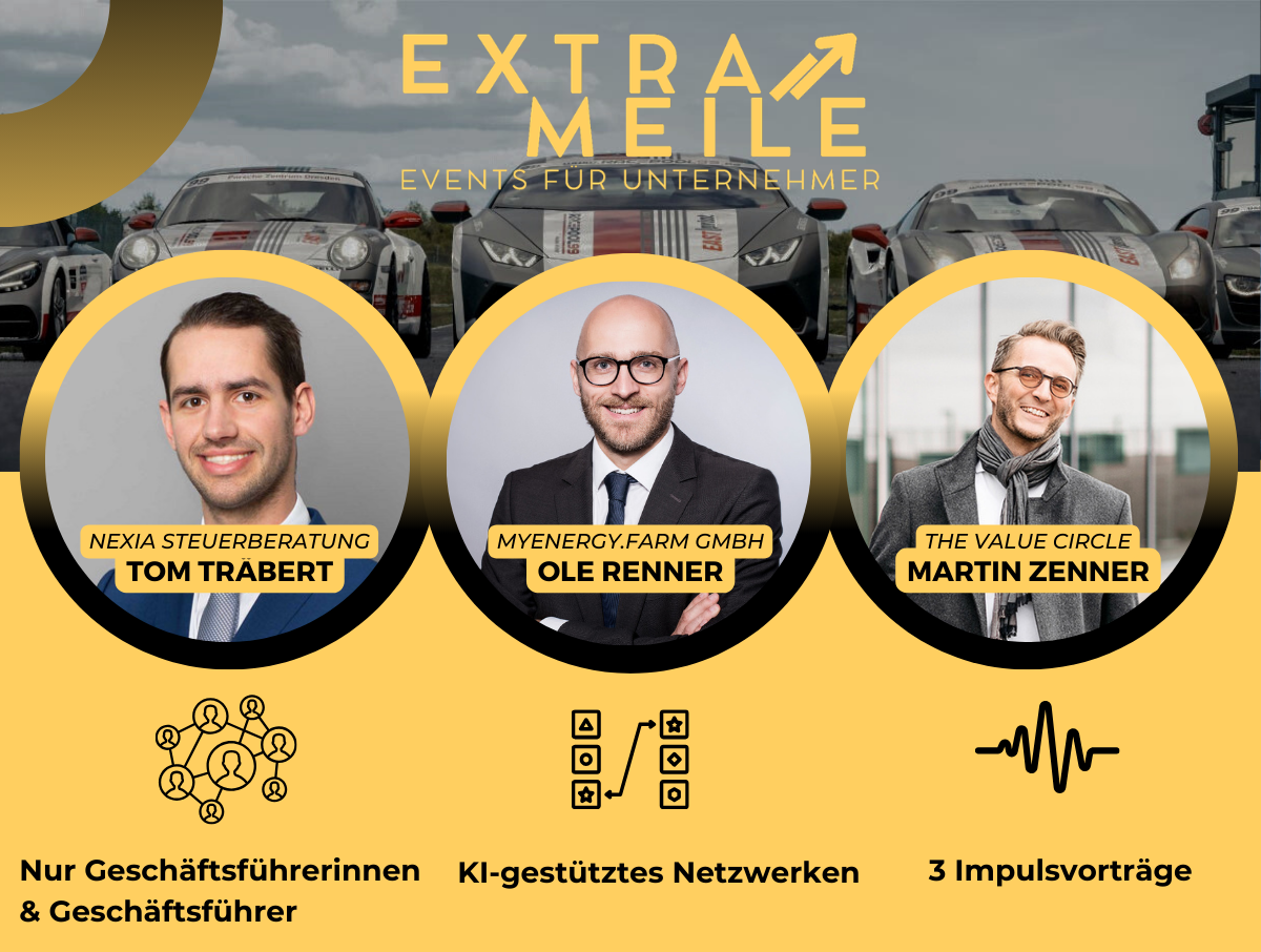 Die ExtraMeile ist ein B2B-Event für Geschäftsführerinnen und Unternehmens-Inhaber, welches Wissensimpulse mit hochkarätigen Gästen in einer außergewöhnlich niederschwelligen Atomsphäre verbindet. Man trifft Entscheider von KMU auf Augenhöhe, die Märkte bewegen und Zukunft gestalten.